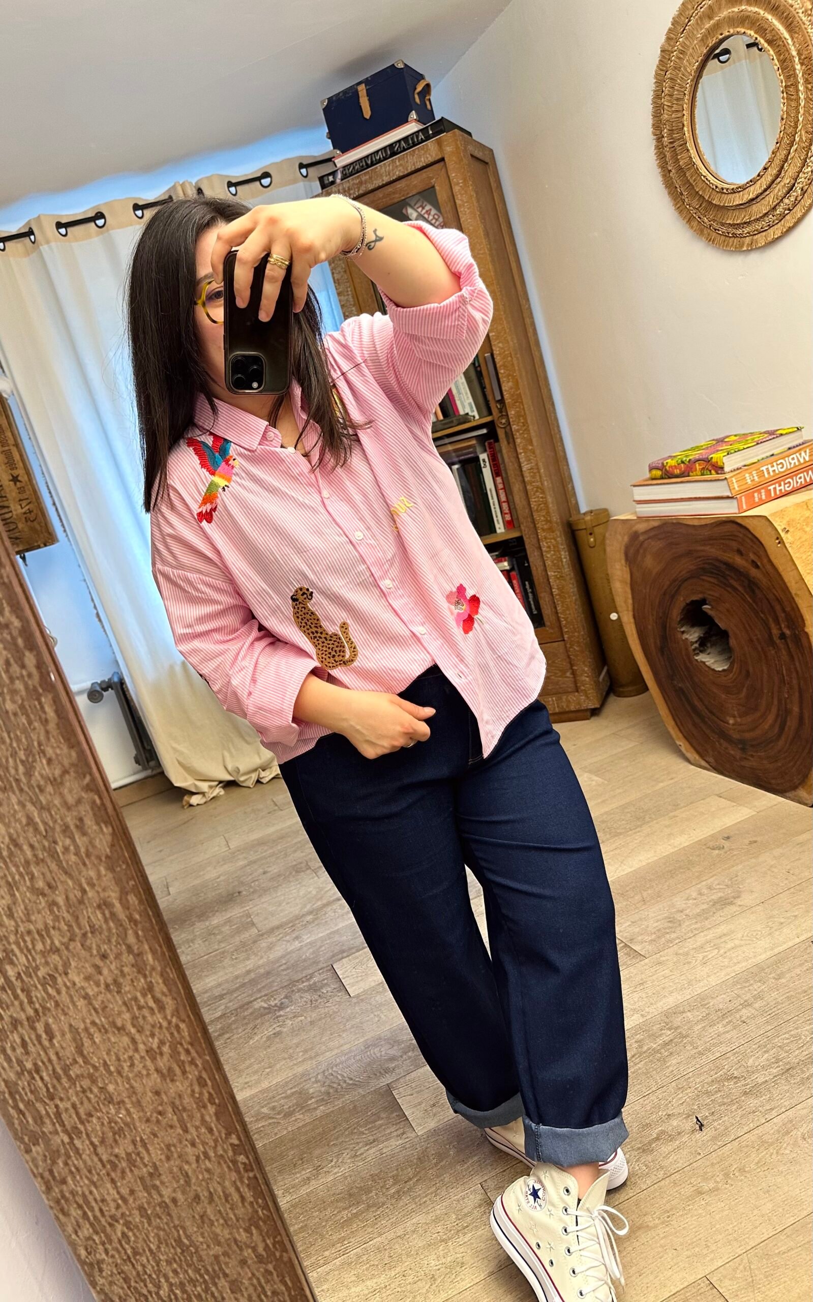 Chemise rayée avec motifs brodés.